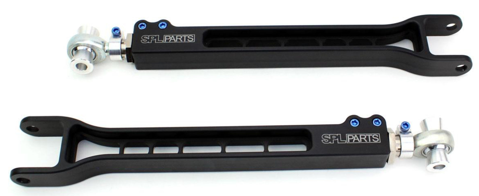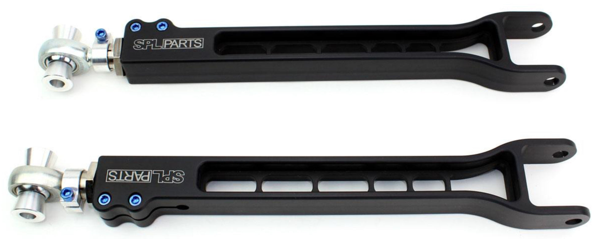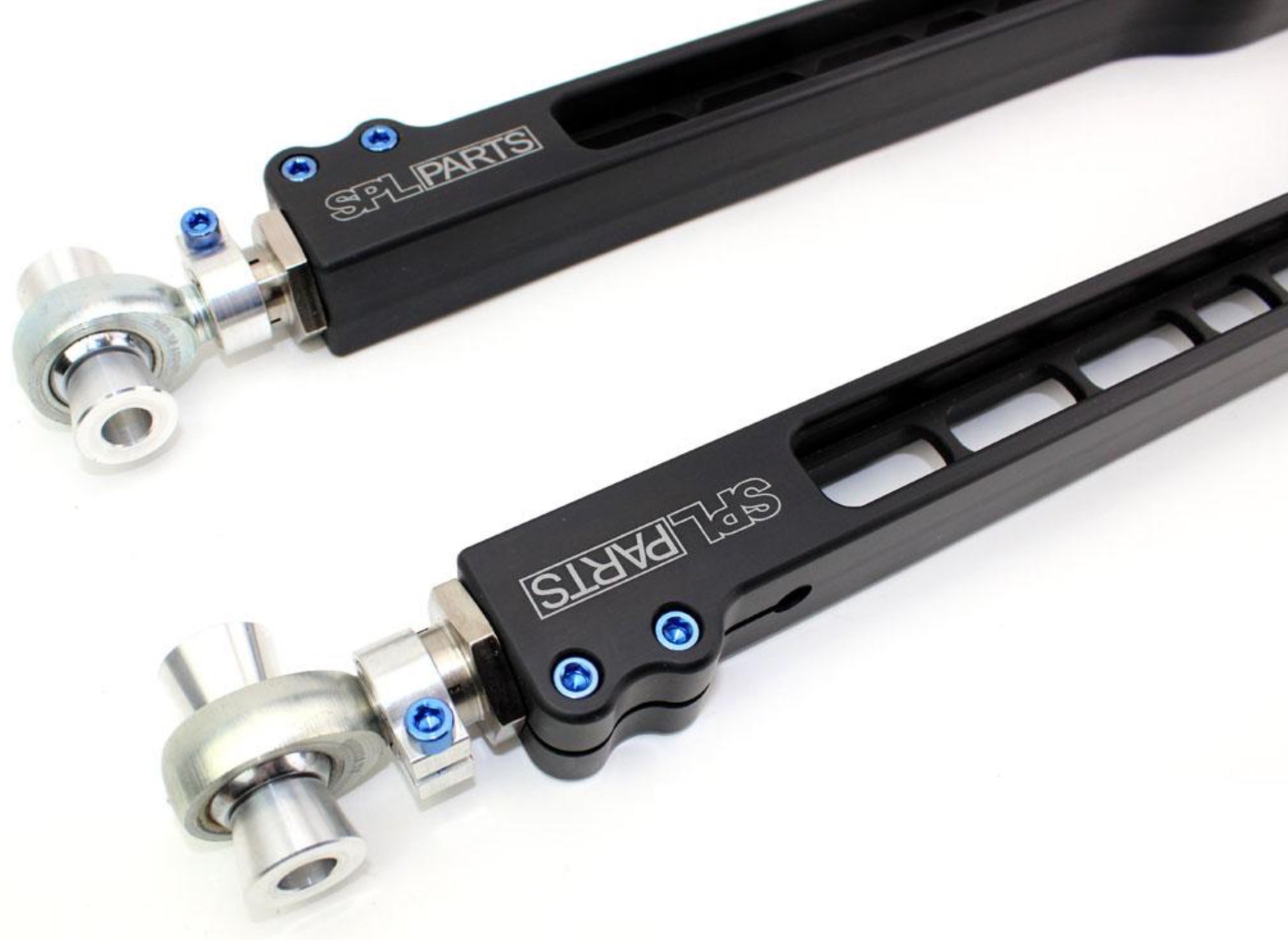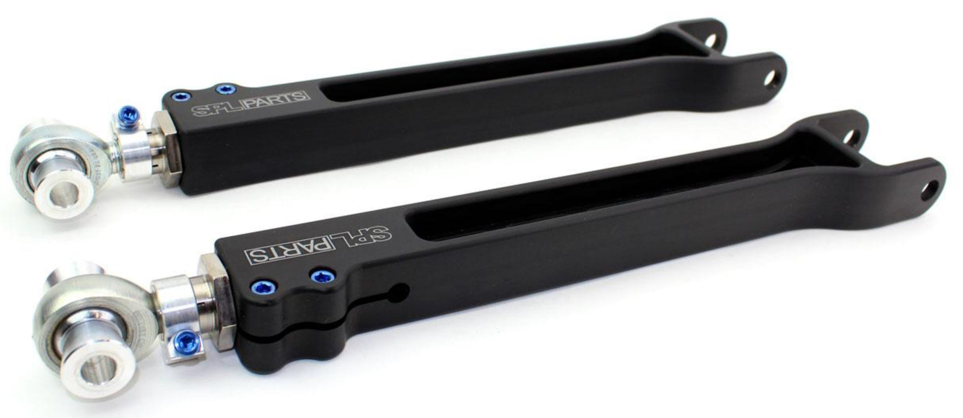 Using FEA (Finite Element Analysis) our CNC milled 6061-T6 Billet Aluminum arms are designed to exceed factory strength and durability. SPL's exclusive Double Adjuster is comprised of electroless nickel plated 4130 Chromoly along with 6061-T6 Aluminum Clamps to reduce weight and prohibit corrosion, while offering quick and easy adjustment. Our Blue Anodized Titanium Hardware shaves even more unsprung weight from the arms, without compromising strength.