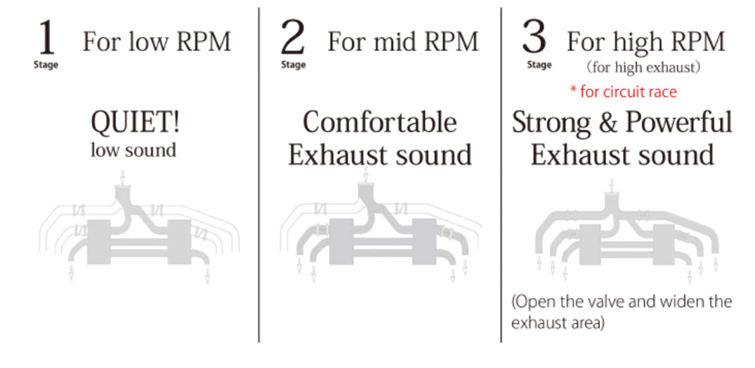 In the automatic mode, the valves are opened or closed by the RPM or automobile speed. For low RPM (Stage 1), all the valves are closed which provides quiet sound. For mid RPM (Stage 2), only the back valves are open for both power and quietness is provided. And finally for high RPM (Stage 3), all the valves are open for the most power. Also the manual mode let you open all the valves.