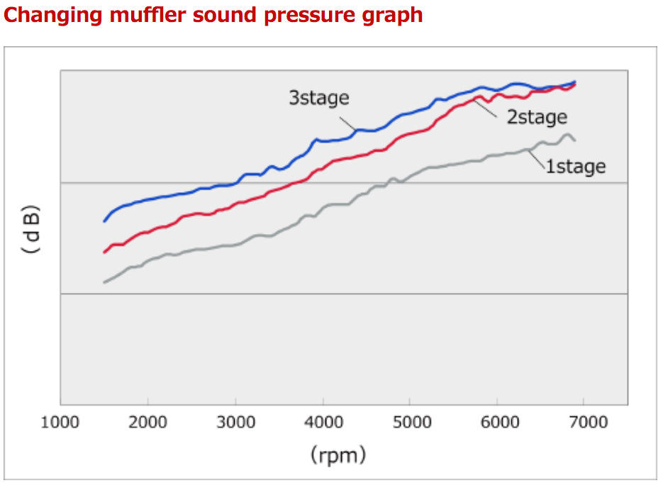 This graph shows each 3 stages testing. We have analyzed muffler's sound pressure and exhaust balance and set the switching point of the stages. (When driving, it automatically changes)