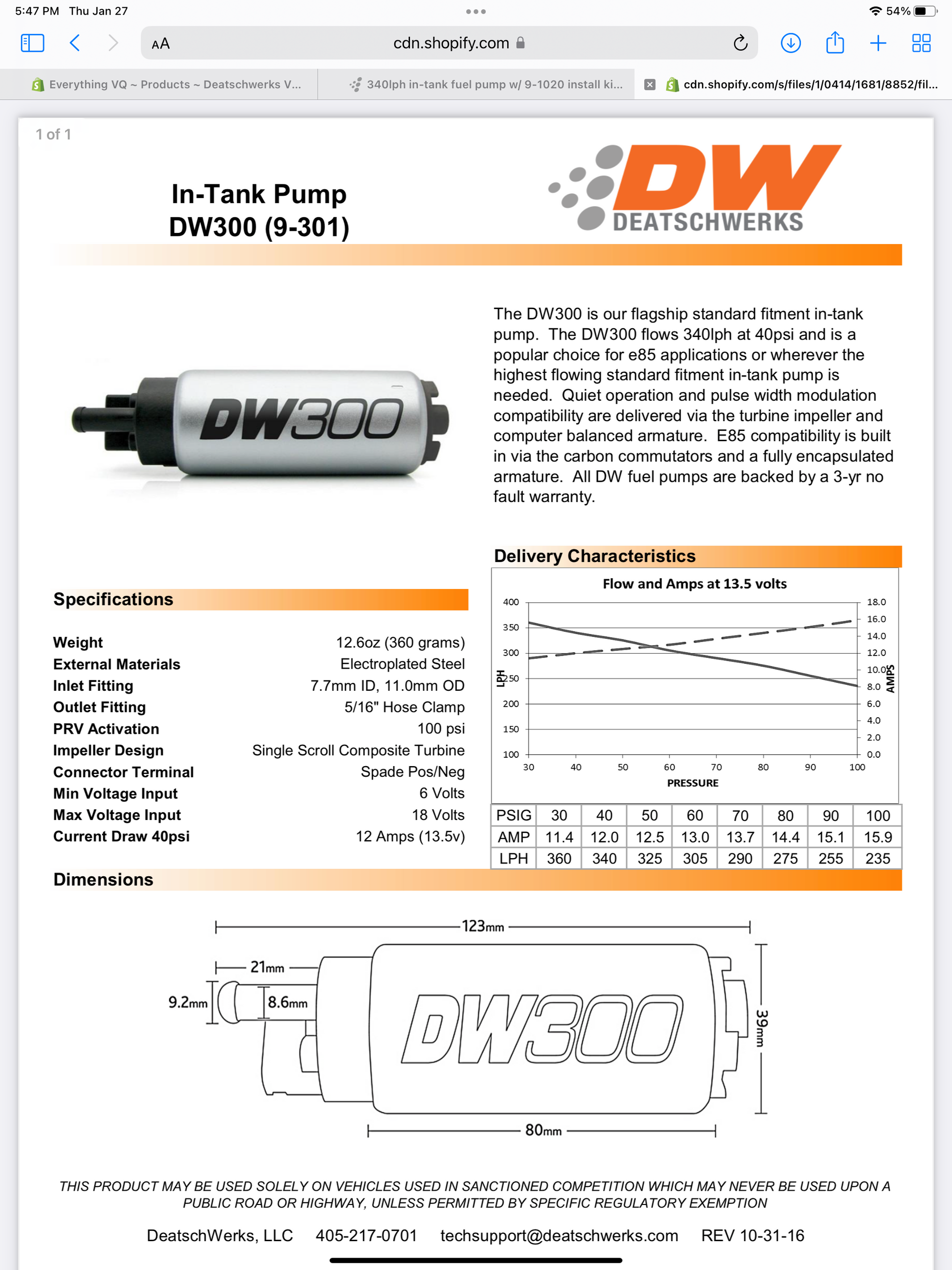 Deatschwerks VHR DW300 series 340lph in-tank fuel pump w/install kit